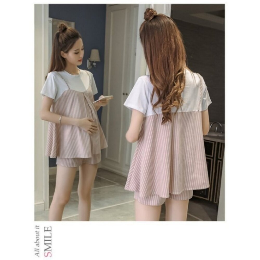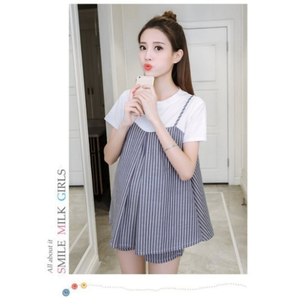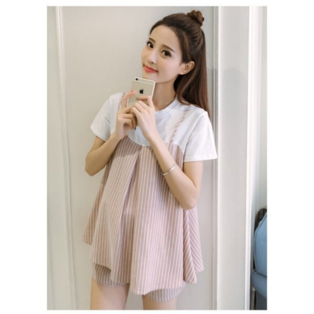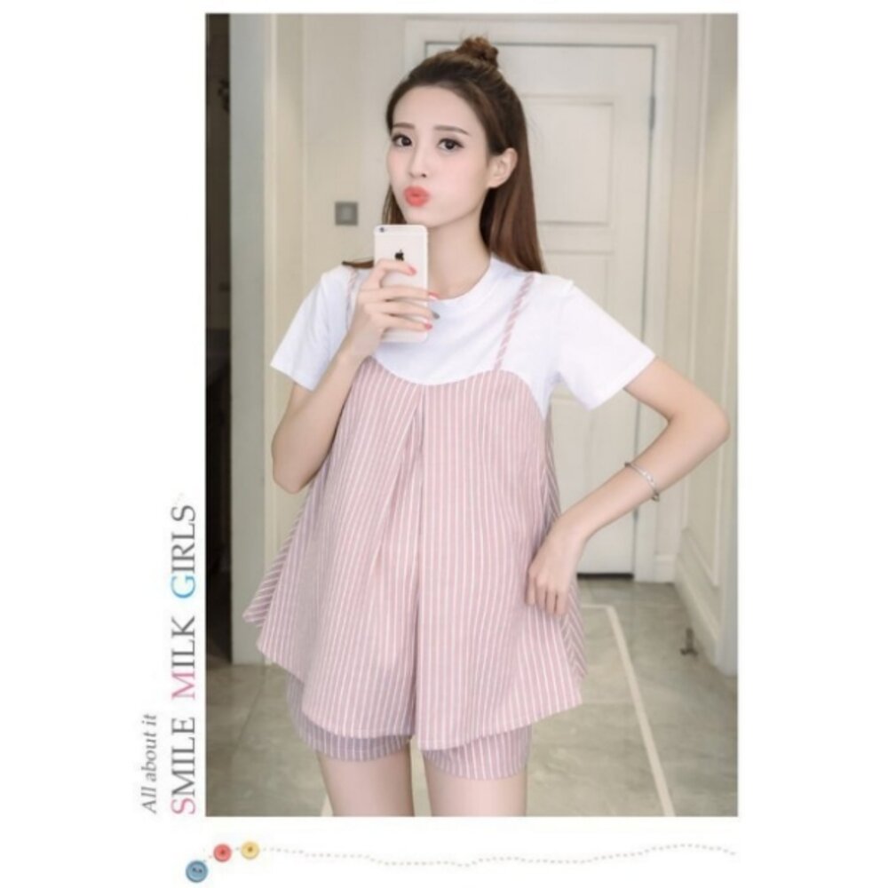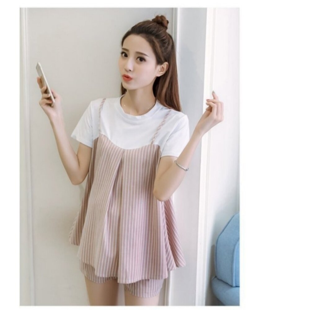 商品資訊/尺寸.F/顏色.粉色.藍灰/材質.棉 尺寸.F./衣長68公分/胸圍.100公分/肩寬.41公分/袖長.16公分/褲長.42公分/腹圍.84公分/臀圍.100公分 商品會因不同批製作的因素,而有尺寸及顏色上些許落差,尺寸測量正負2公分為正常範圍內喔! 其他資料平放測量平面尺寸