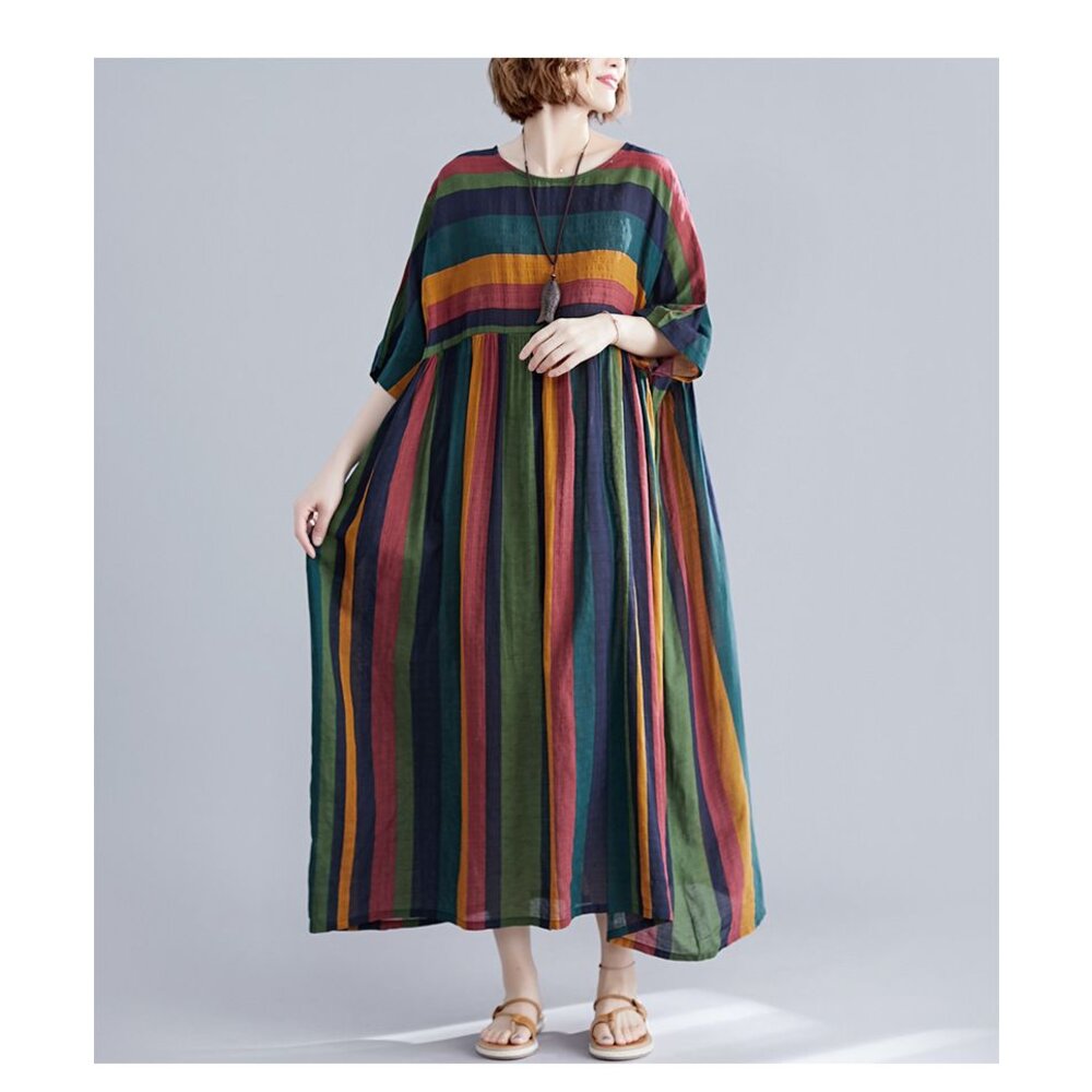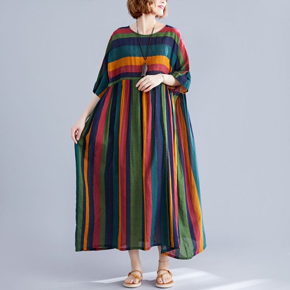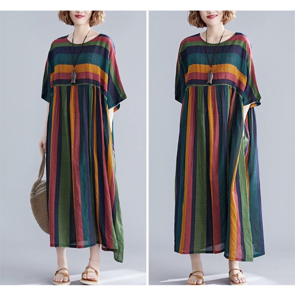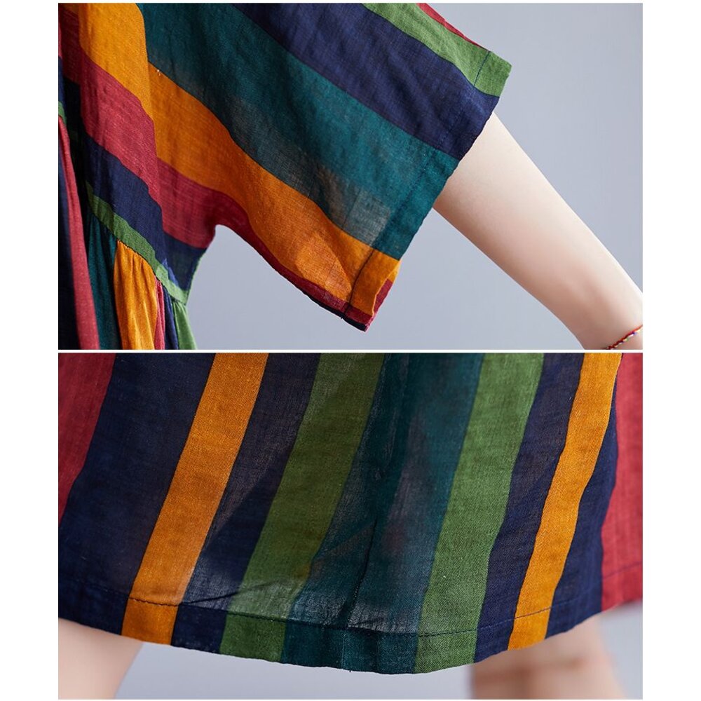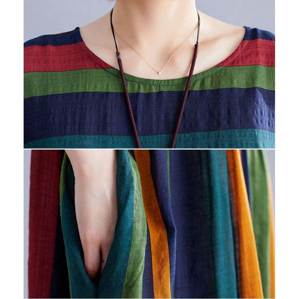 商品資訊/尺寸F/顏色.照片色/材質.棉麻/ 規格尺寸. F.裙長.120公分/胸圍.142公分/肩寬.不限/袖長.連肩袖/裙襬.130公分 商品會因不同批製作的因素,而有尺寸及顏色上些許落差,尺寸測量正負2公分為正常範圍內喔! 其他資料平放測量平面尺寸