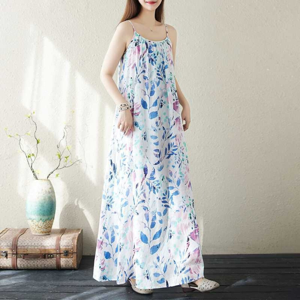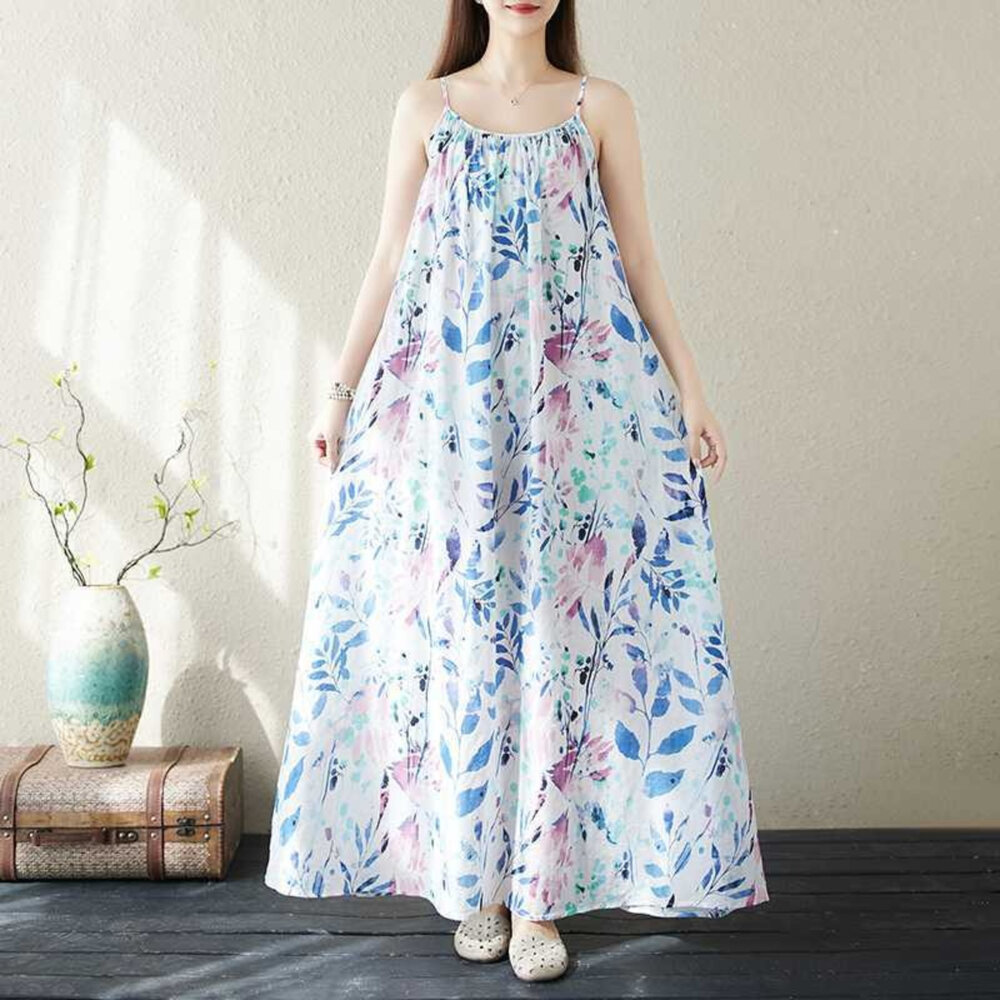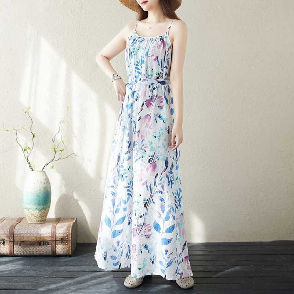 商品資訊/尺寸.F/顏色.照片色/材質.棉麻 尺寸. F./裙長.120公分(不含肩帶)130公分(含肩帶)/胸圍.120公分/下擺.242公分 商品會因不同批製作的因素,而有尺寸及顏色上些許落差,尺寸測量正負2公分為正常範圍內喔! 其他資料平放測量平面尺寸
