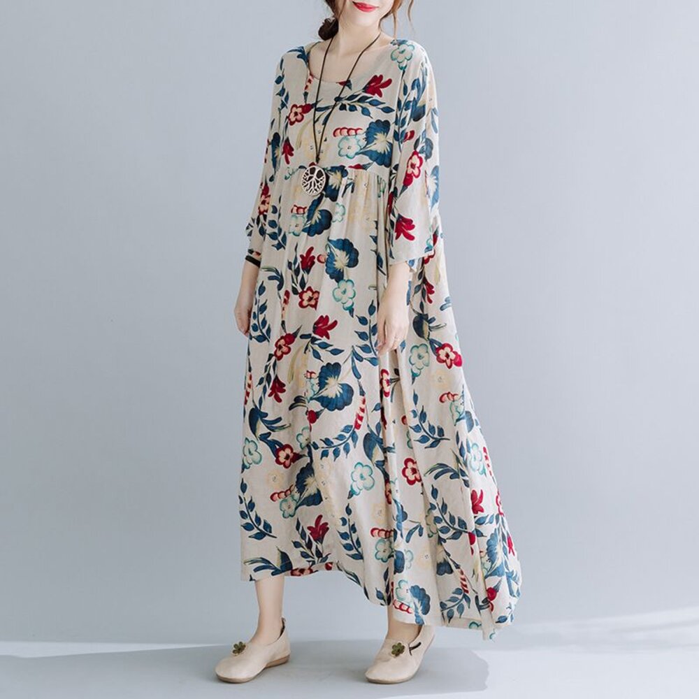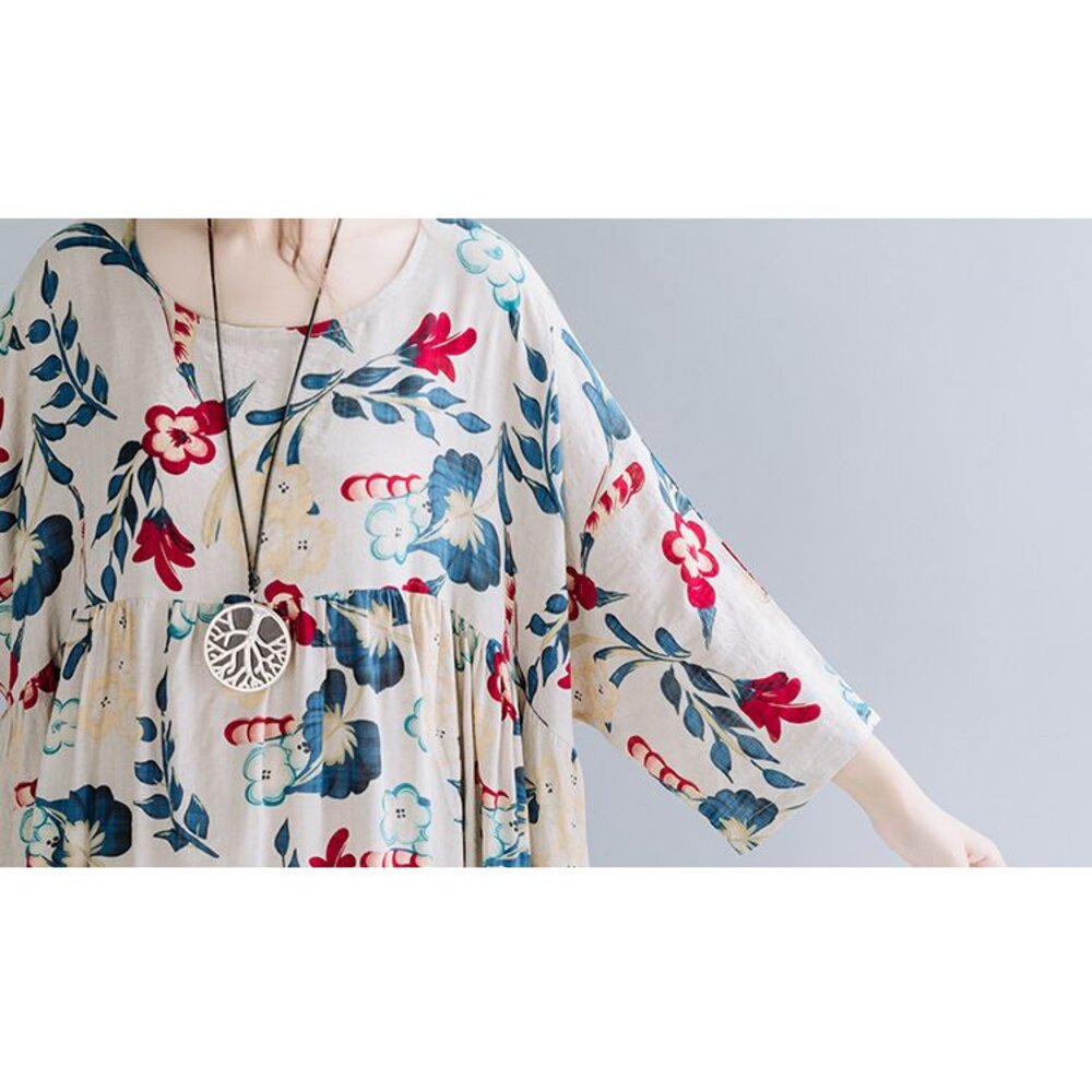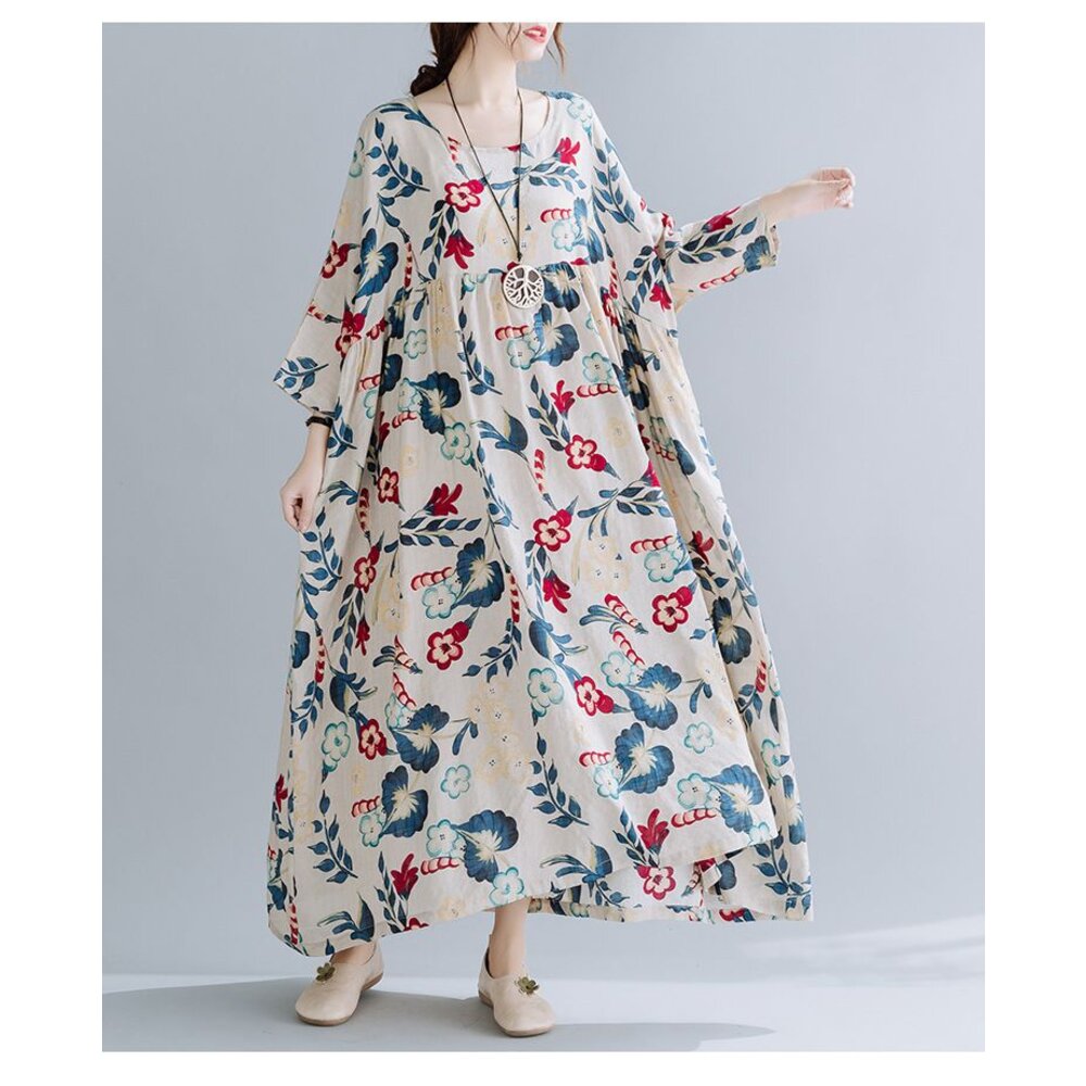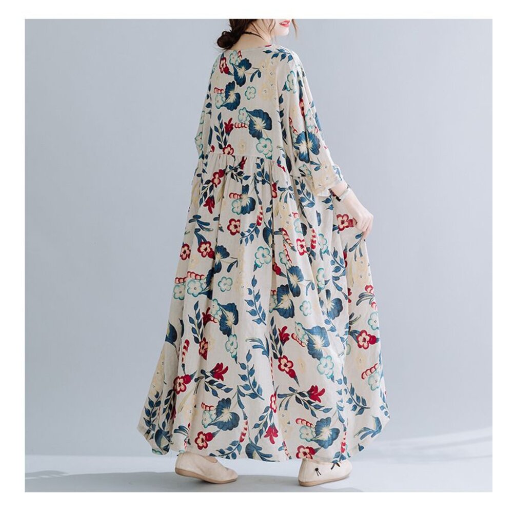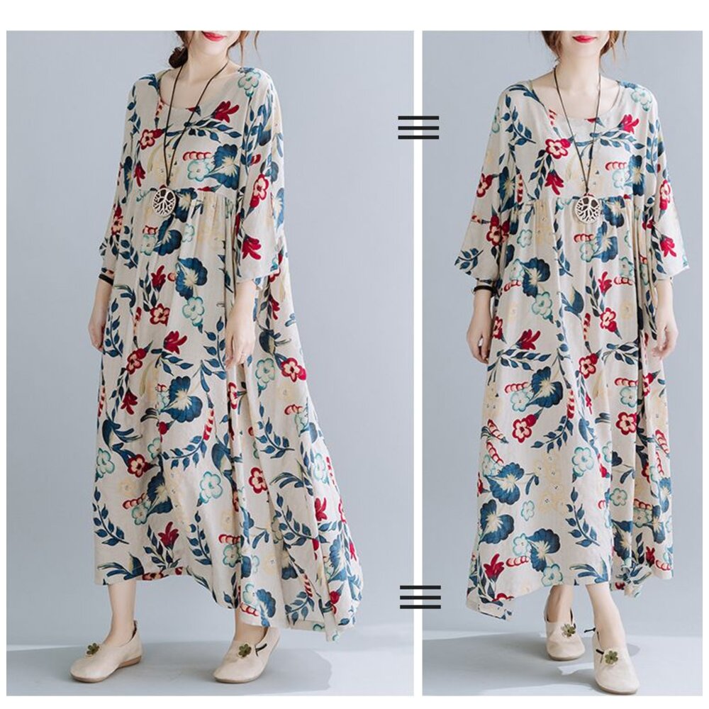商品資訊/尺寸F/顏色.照片色/材質.棉麻 尺寸. F./裙長125公分/胸圍.160公分/袖長.50公分/肩連袖 商品會因不同批製作的因素,而有尺寸及顏色上些許落差,尺寸測量正負2公分為正常範圍內喔! 其他資料平放測量平面尺寸
