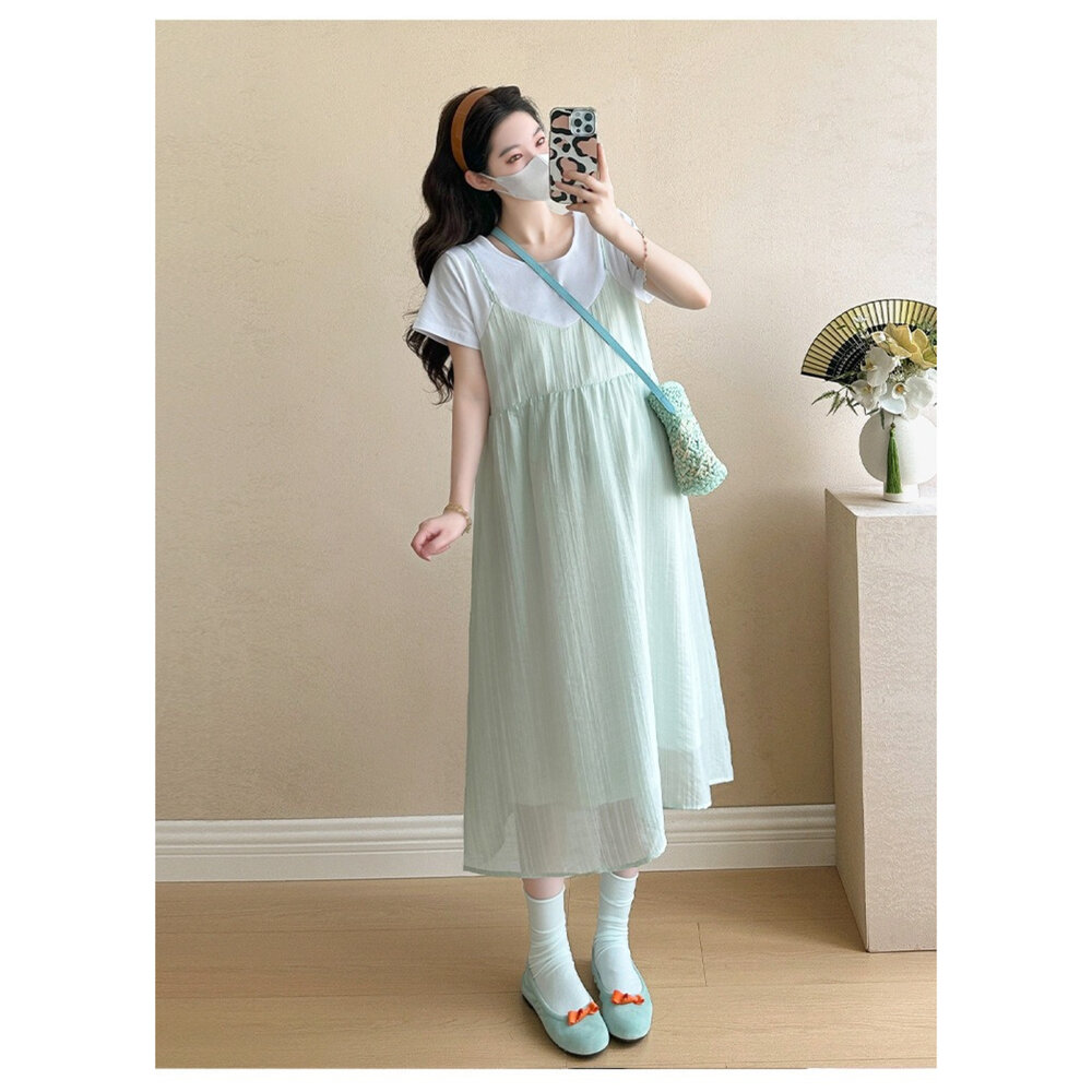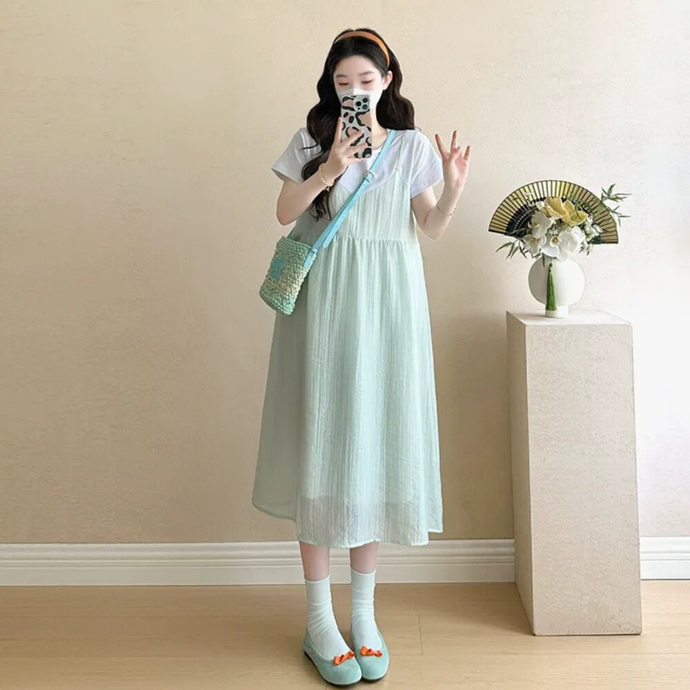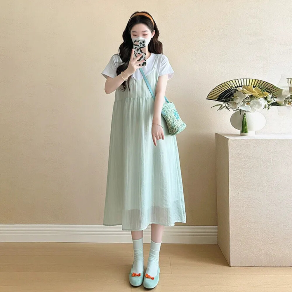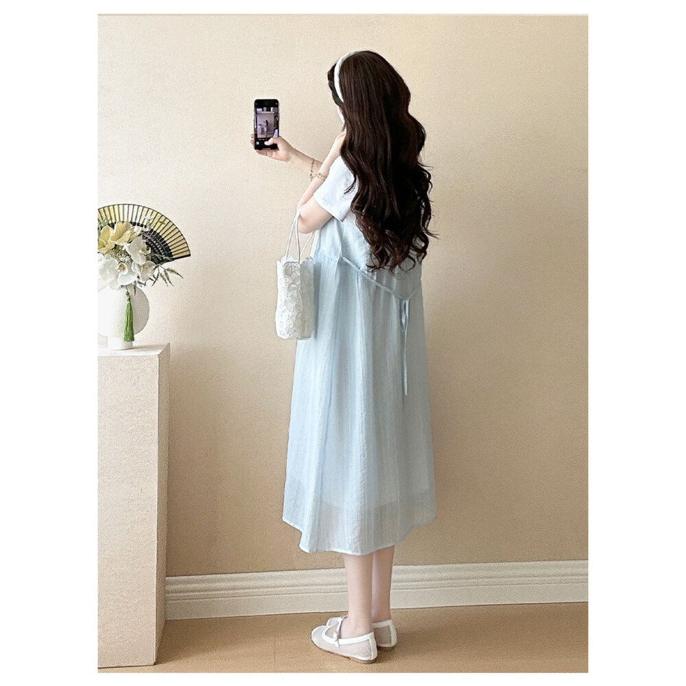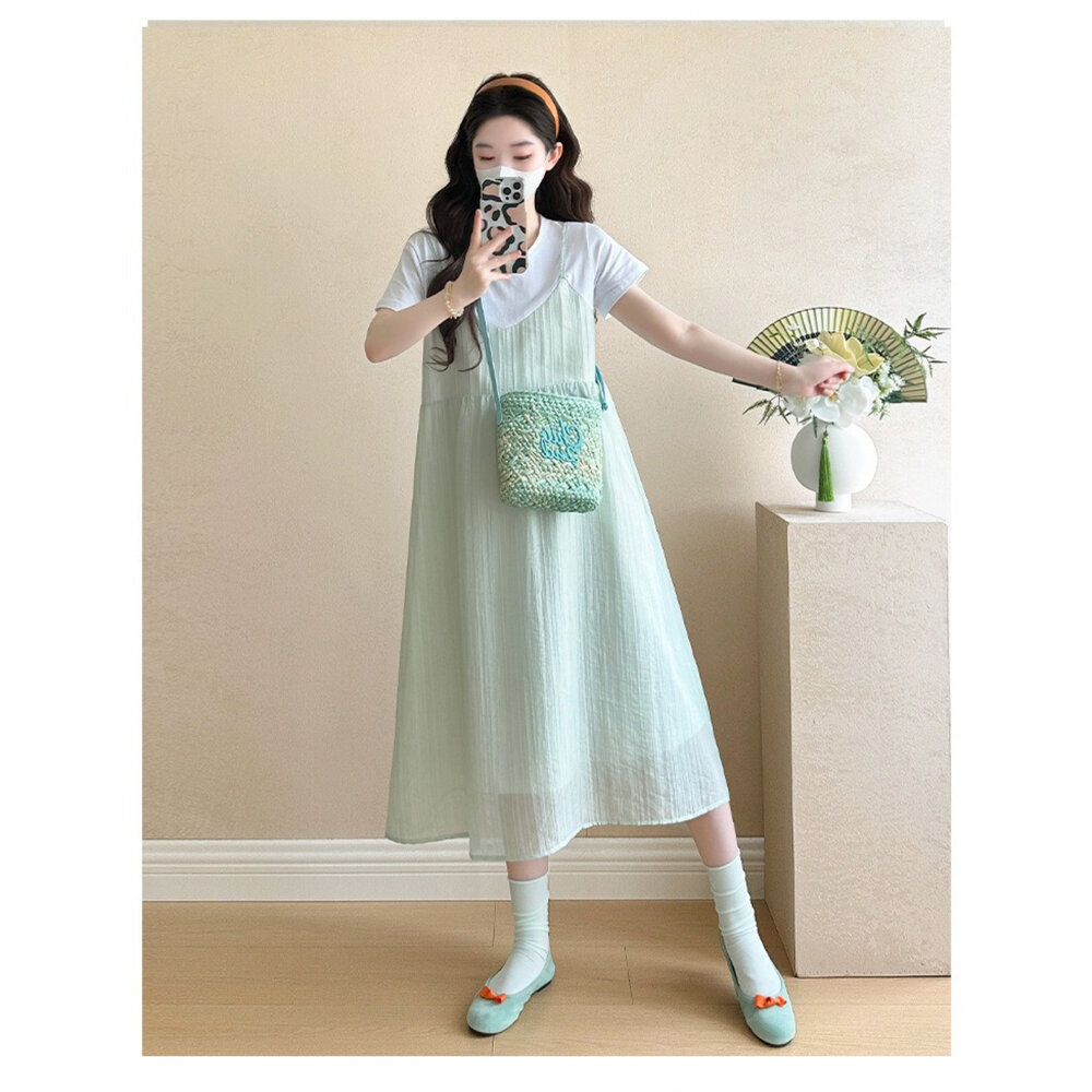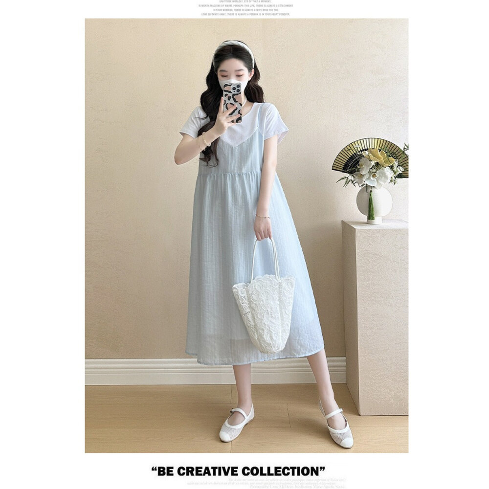 商品資訊/尺寸.F/顏色.照片色/材質/成分.棉+人造纖維 規格/尺寸.F.裙長.107公分/胸圍.104公分/肩寬.37公分/袖長.17公分 商品會因不同批製作的因素,而有尺寸及顏色上些許落差,尺寸測量正負2公分為正常範圍內喔! 其他資料平放測量平面尺寸