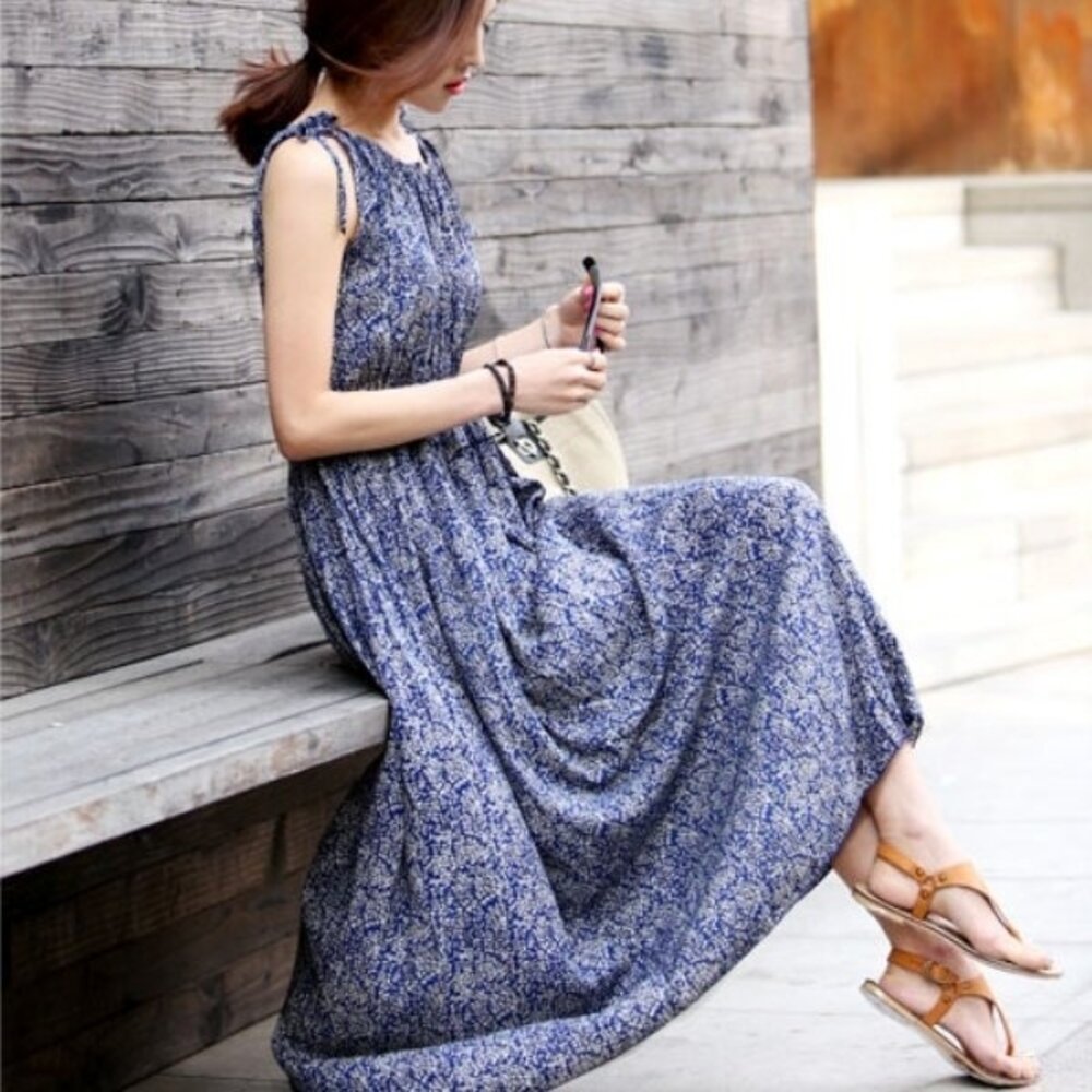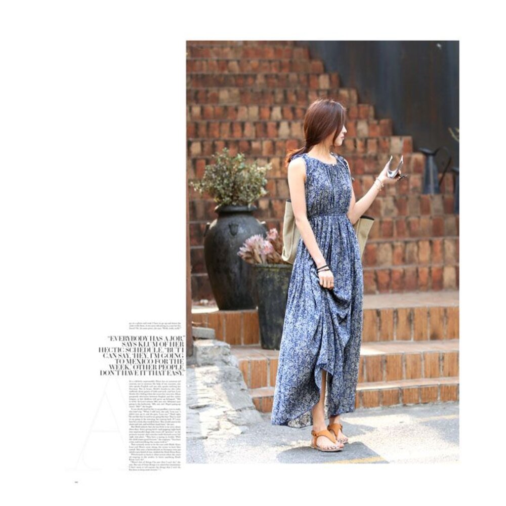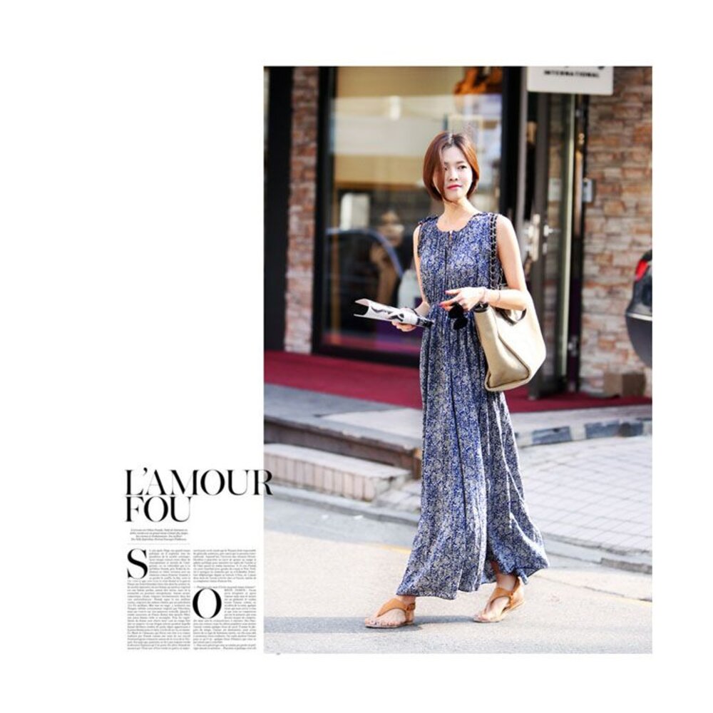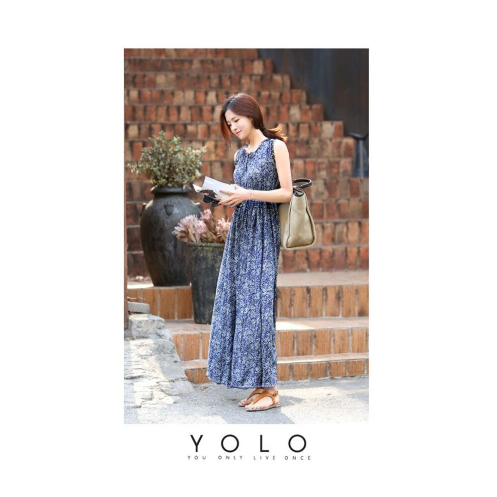 【D5012YB】 M碼 夏日 波西米亞 無袖 縲縈 長裙 無袖 碎花 長洋裝 連衣裙 洋裝 韓系-圖片-8