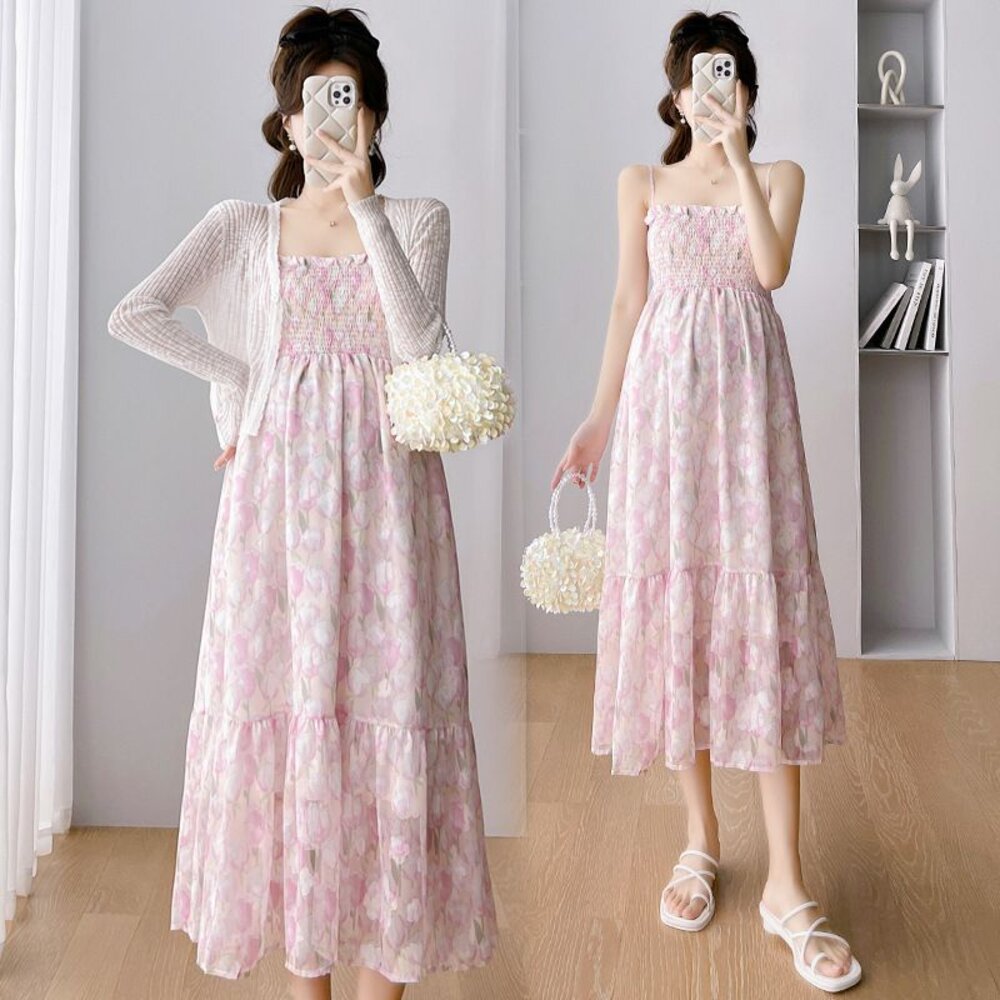 商品資訊/尺寸F/顏色.照片色/材質.雪紡/ (不含針織外套) 規格尺寸. 洋裝. F.裙長.98公分不含吊帶/鬆緊胸圍.112公分/ 商品會因不同批製作的因素,而有尺寸及顏色上些許落差,尺寸測量正負2公分為正常範圍內喔! 其他資料平放測量平面尺寸