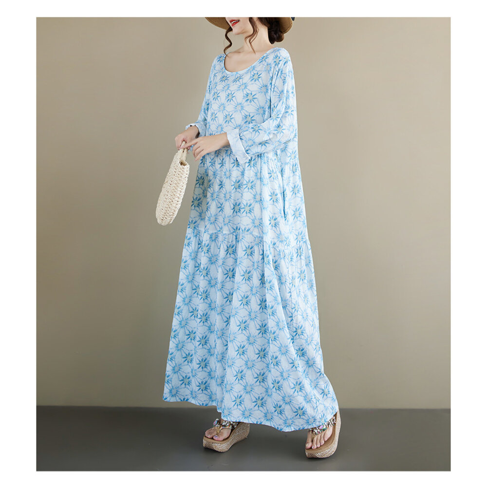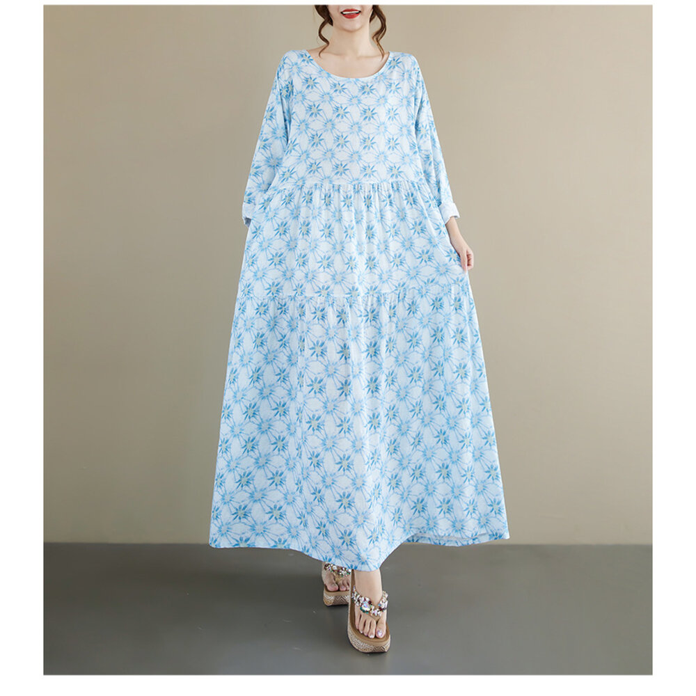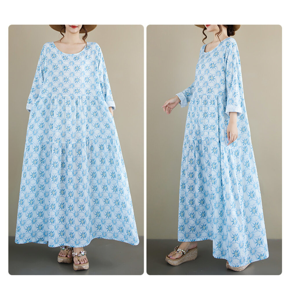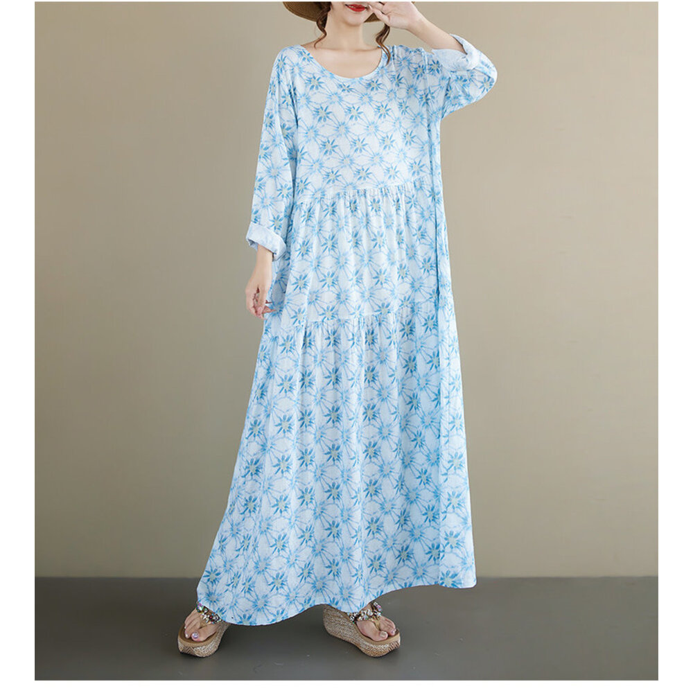商品資訊/尺寸F/顏色.照片色/材質.棉 尺寸. F./裙長130公分/胸圍.122公分/袖長.61公分/肩寬.44公分 商品會因不同批製作的因素,而有尺寸及顏色上些許落差,尺寸測量正負2公分為正常範圍內喔! 其他資料平放測量平面尺寸