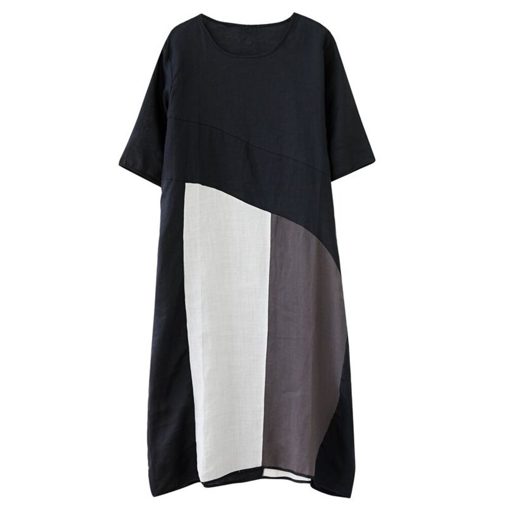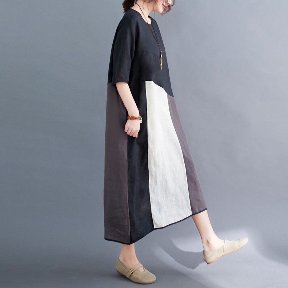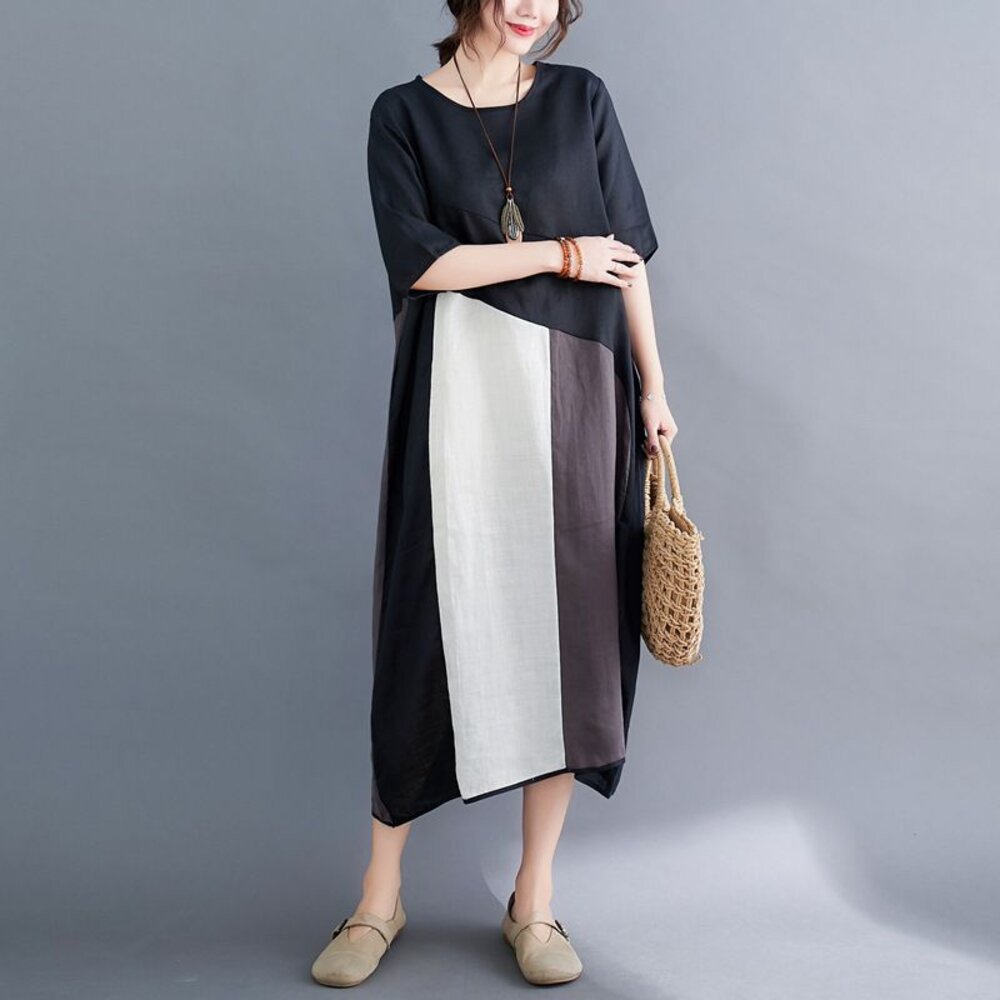 商品資訊/尺寸F/顏色.黑色/材質.棉麻 尺寸.F./ 裙長.117公分/胸圍.124公分/袖長.34公分/肩寬.44公分 商品會因不同批製作的因素,而有尺寸及顏色上些許落差,尺寸測量正負2公分為正常範圍內喔! 其他資料平放測量平面尺寸
