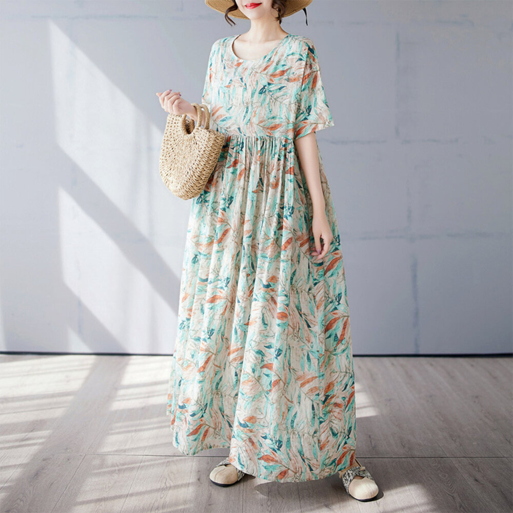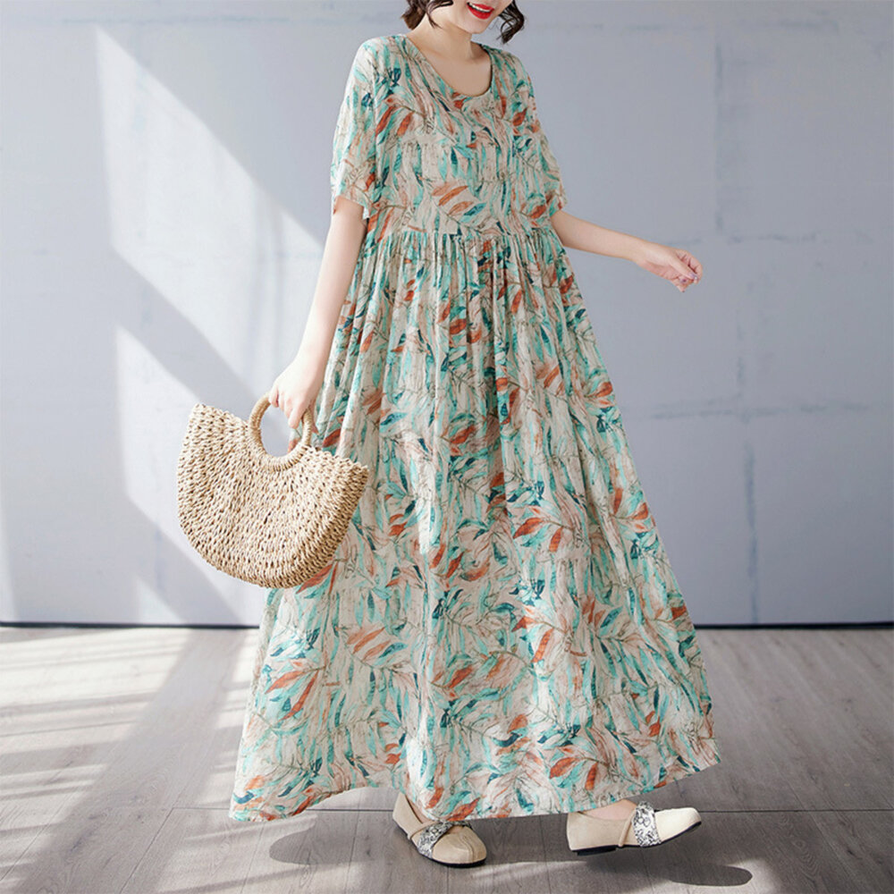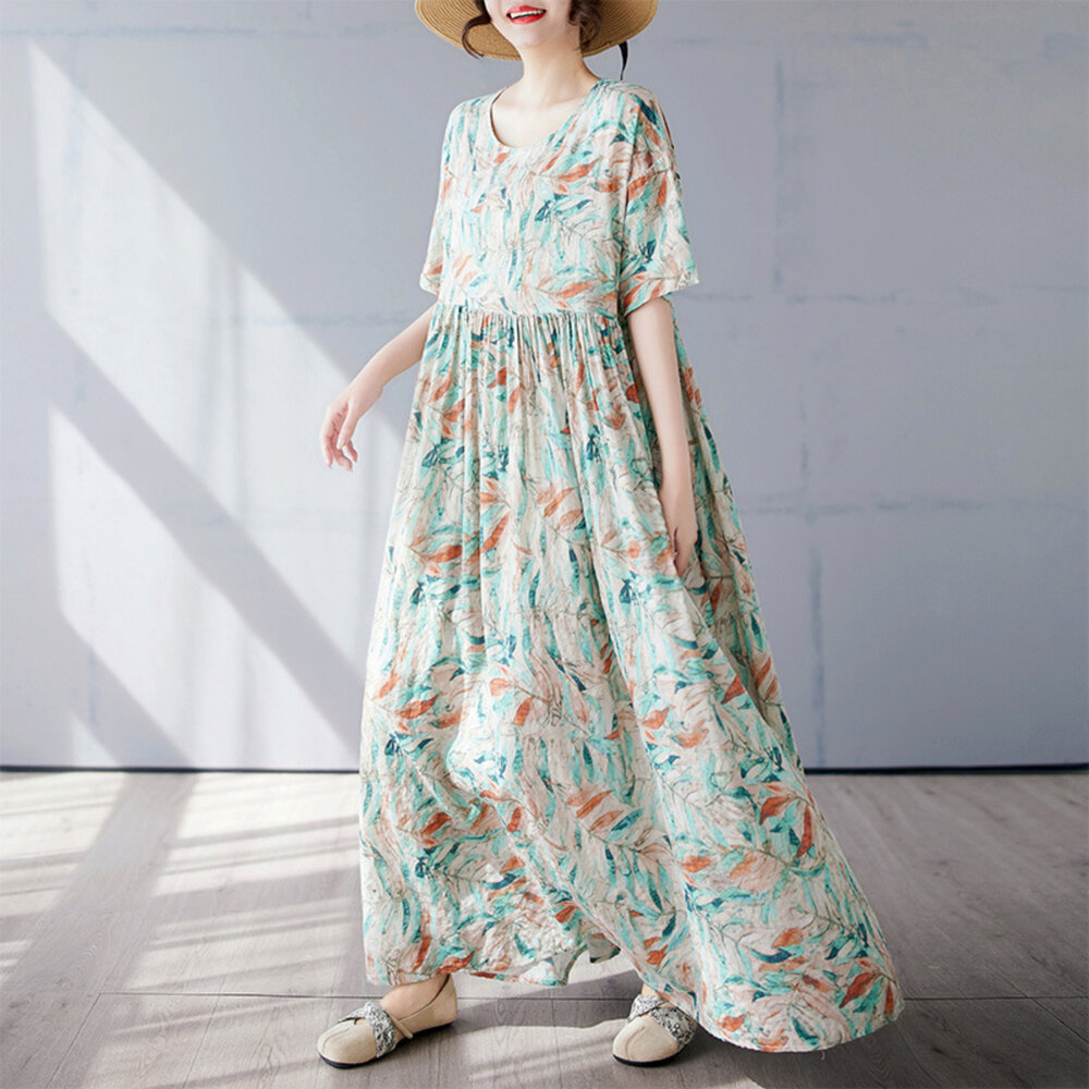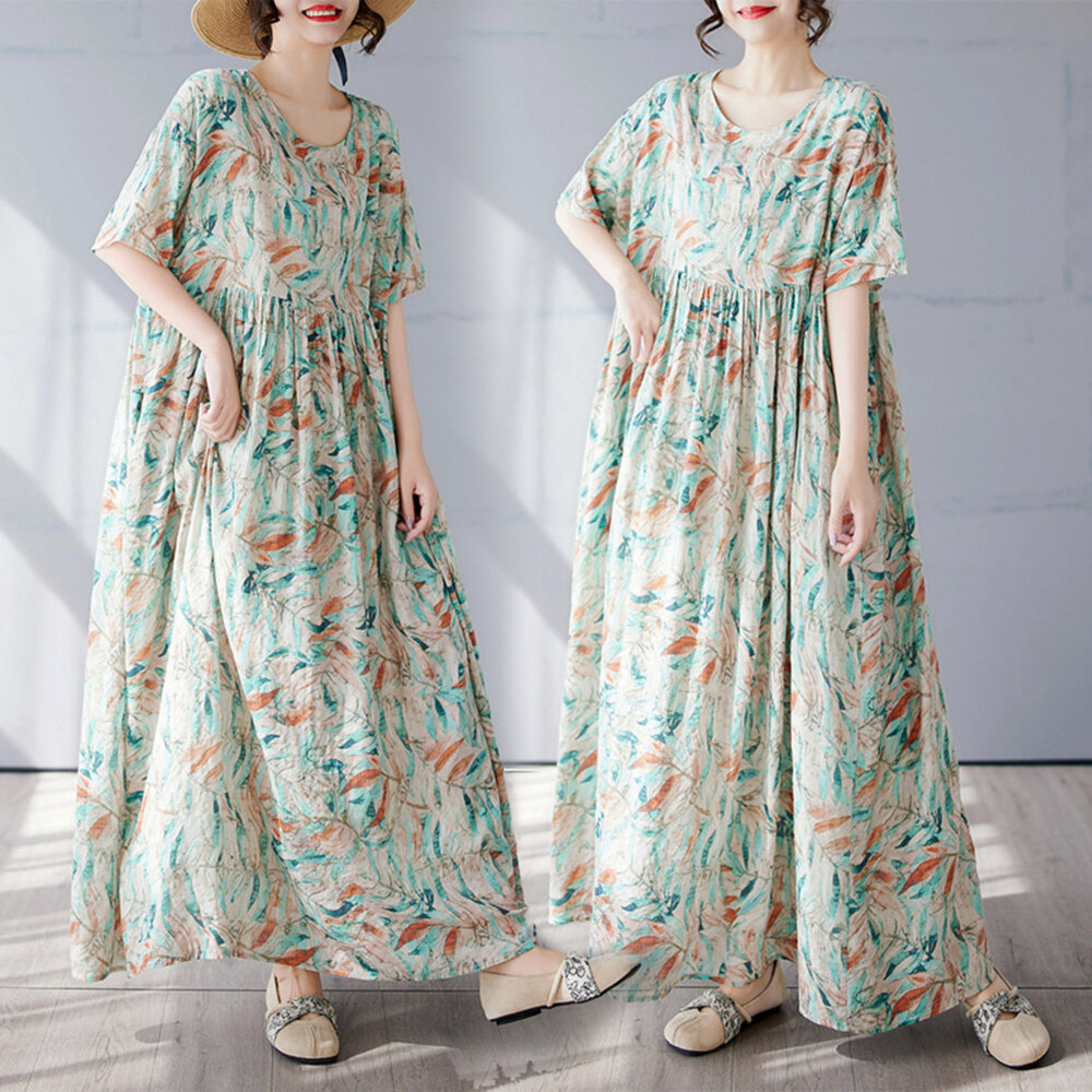 商品資訊/尺寸.F/顏色.照片色/材質.棉麻 尺寸. F./裙長.120公分/胸圍.142公分/肩寬.50公分/袖長.20公分 商品會因不同批製作的因素,而有尺寸及顏色上些許落差,尺寸測量正負2公分為正常範圍內喔! 其他資料平放測量平面尺寸