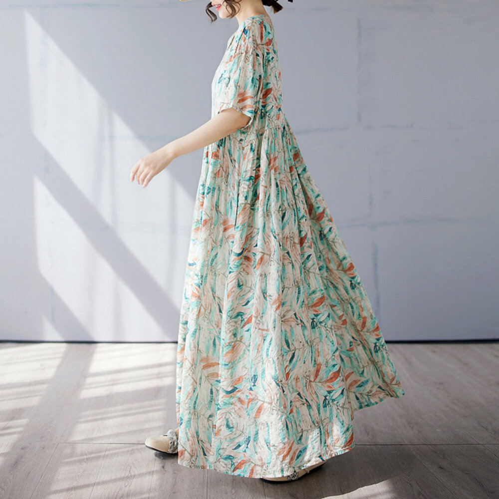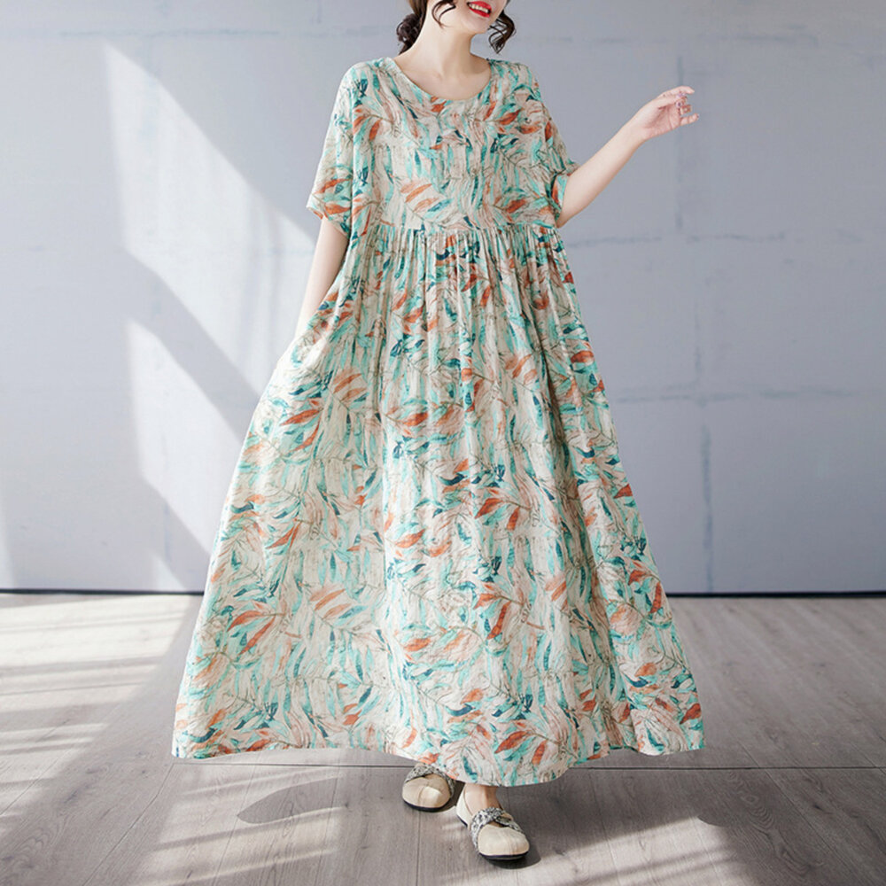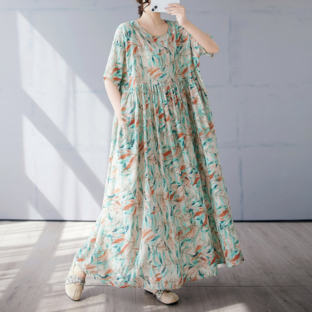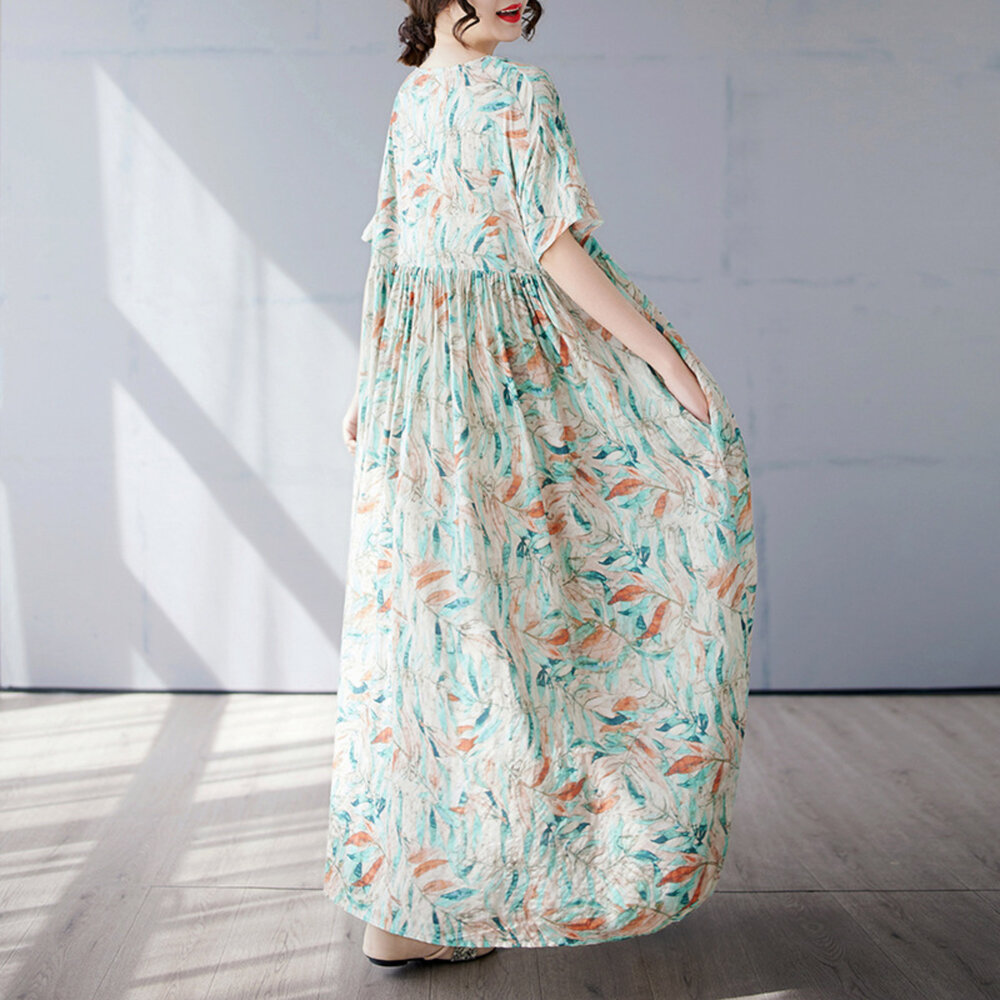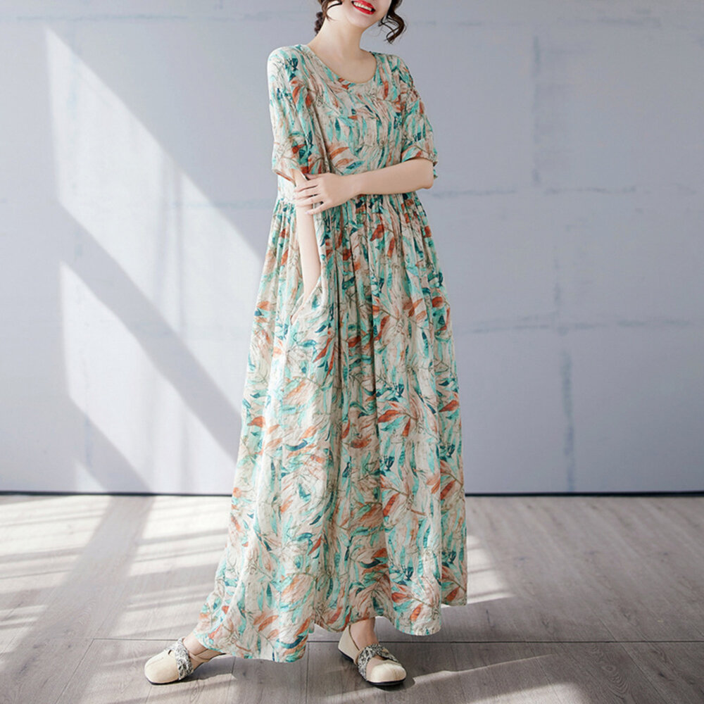 商品資訊/尺寸.F/顏色.照片色/材質.棉麻 尺寸. F./裙長.120公分/胸圍.142公分/肩寬.50公分/袖長.20公分 商品會因不同批製作的因素,而有尺寸及顏色上些許落差,尺寸測量正負2公分為正常範圍內喔! 其他資料平放測量平面尺寸
