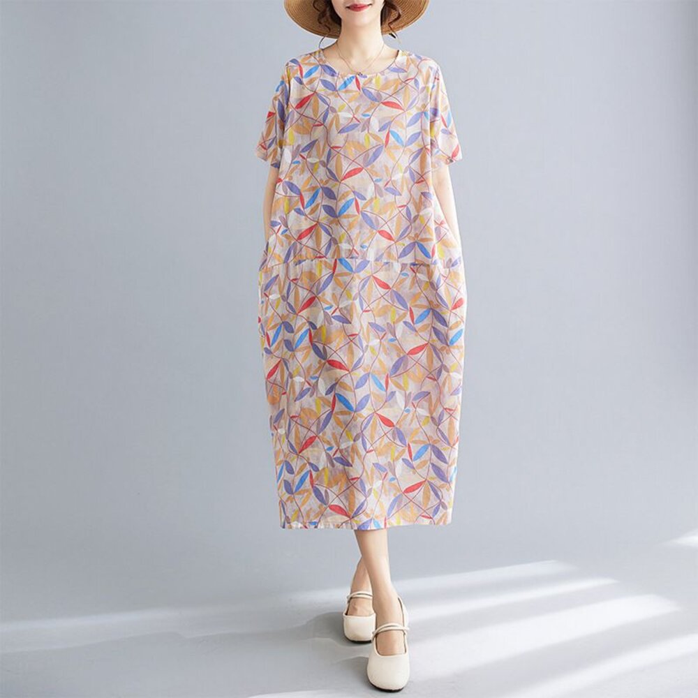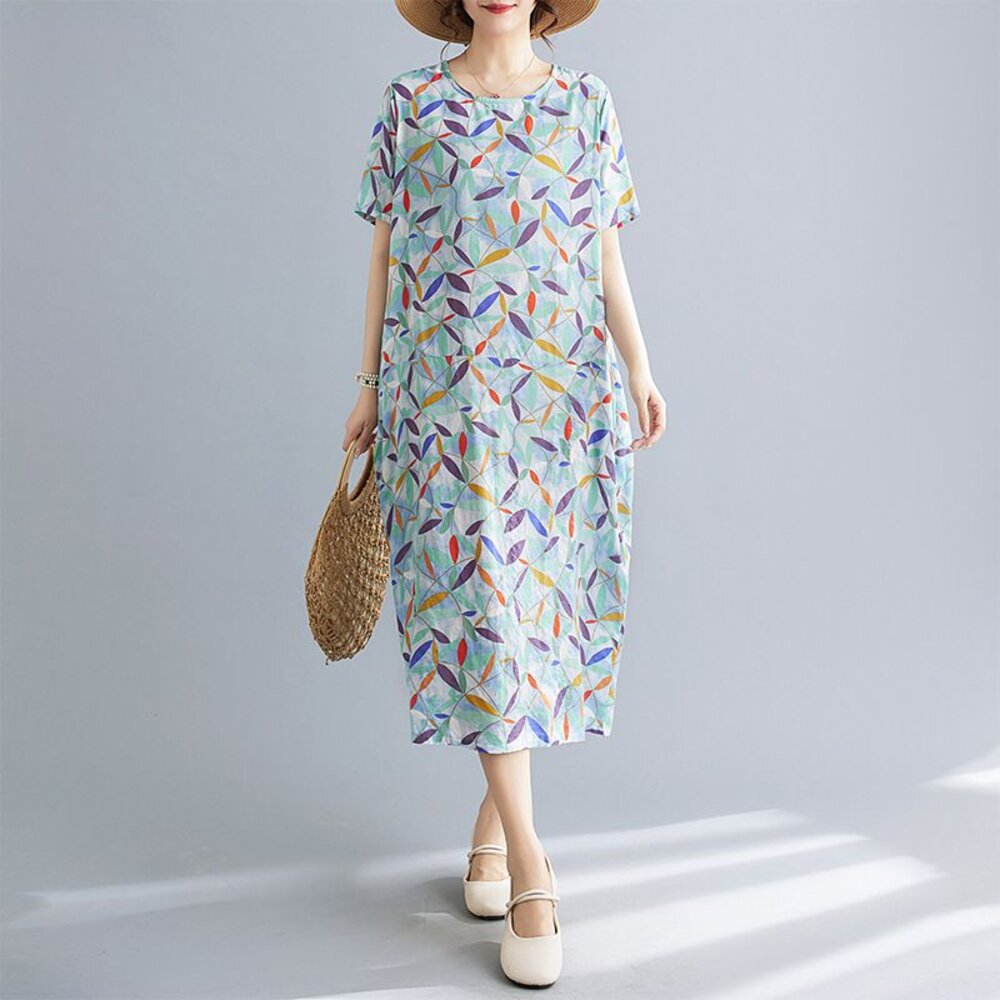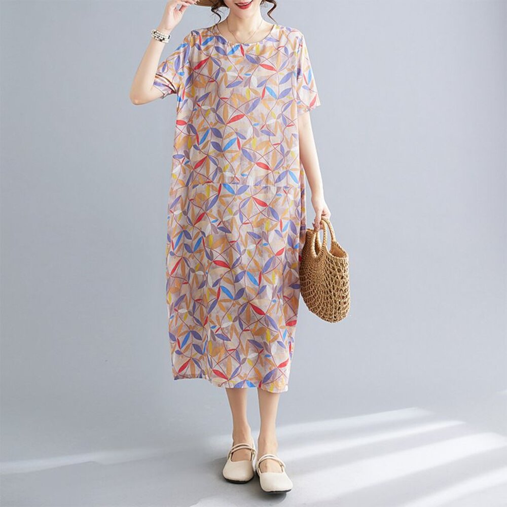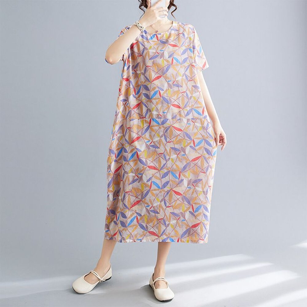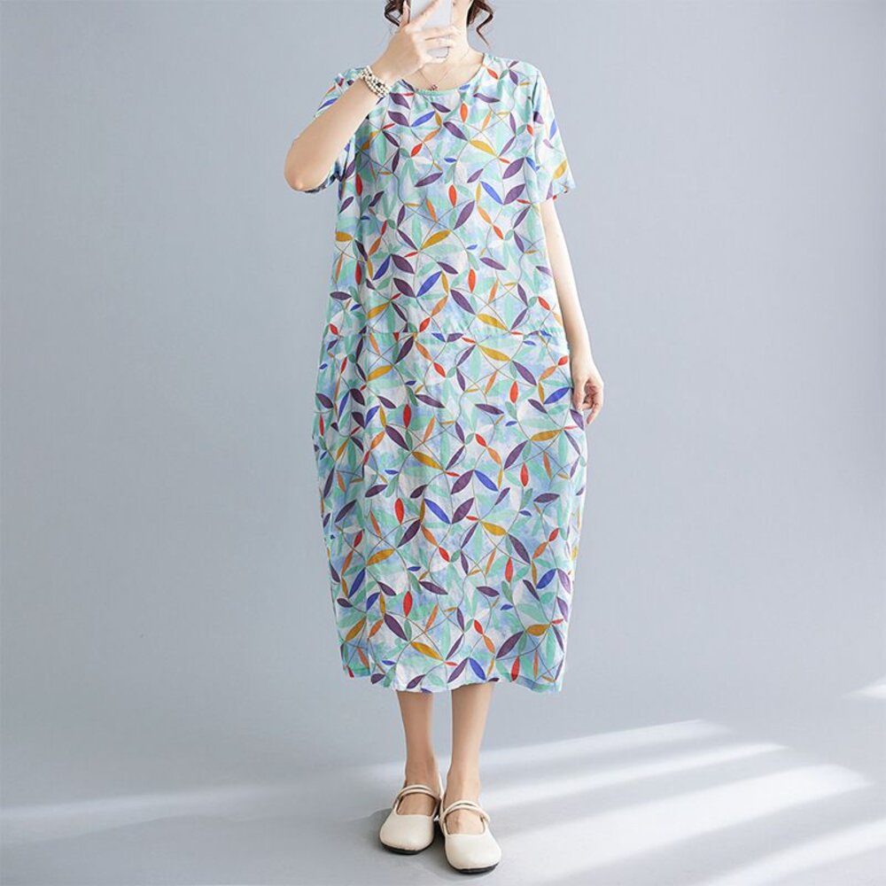 商品資訊/尺寸F/顏色.照片色/材質.棉麻/ 規格尺寸. F.裙長.114公分/胸圍.122公分/袖長.23公分/肩寬.40公分 商品會因不同批製作的因素,而有尺寸及顏色上些許落差,尺寸測量正負2公分為正常範圍內喔! 其他資料平放測量平面尺寸