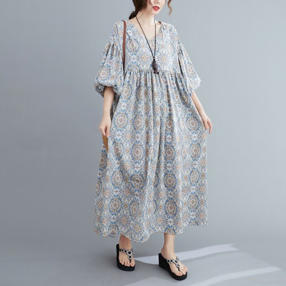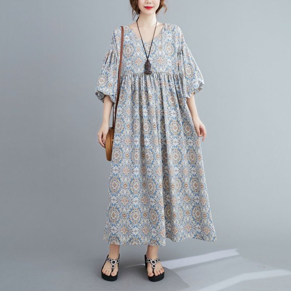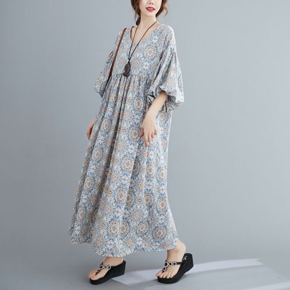 商品資訊/尺寸F/顏色.照片色/材質.棉/ 規格尺寸. F.裙長.125公分/胸圍.118公分/肩寬.64公分/袖長.29公分/肩連袖.49公分 商品會因不同批製作的因素,而有尺寸及顏色上些許落差,尺寸測量正負2公分為正常範圍內喔! 其他資料平放測量平面尺寸