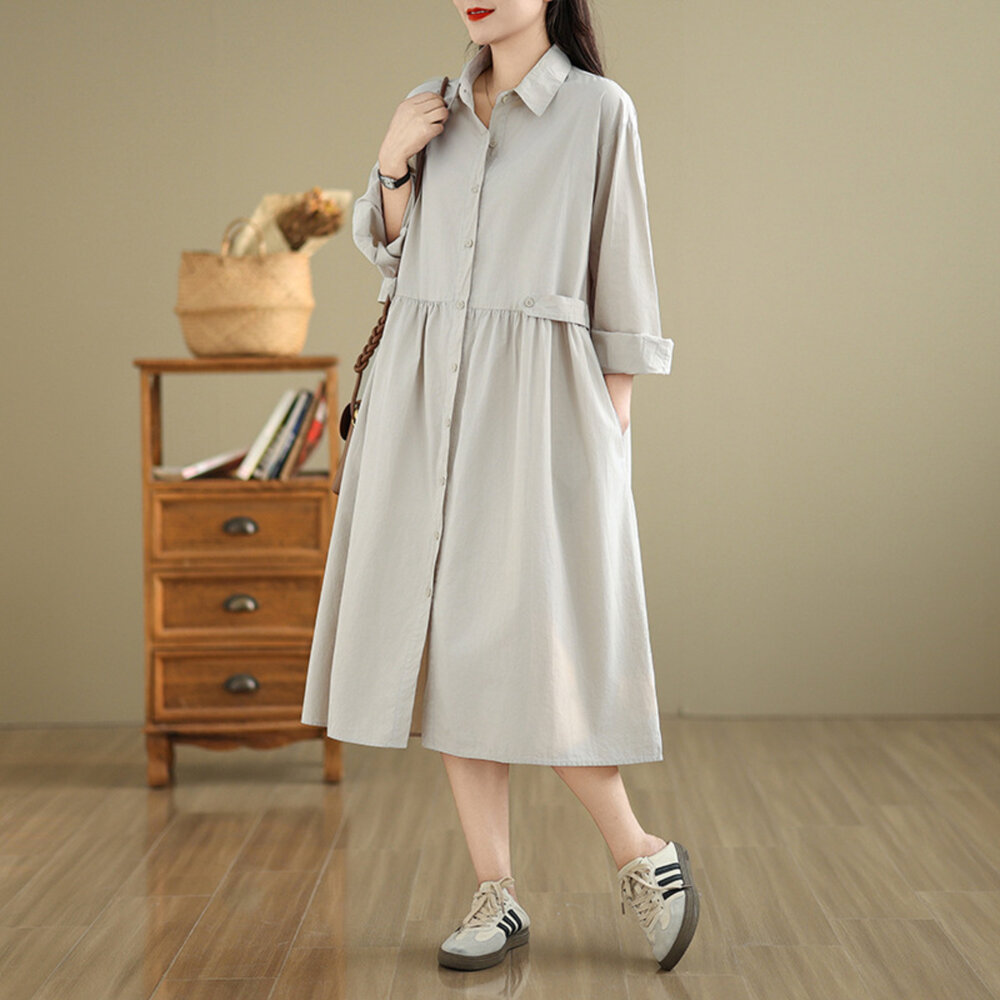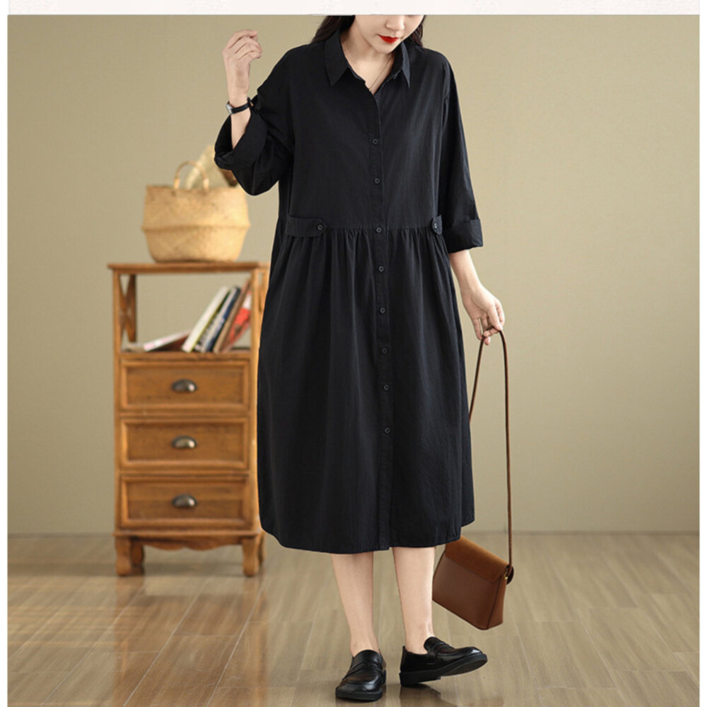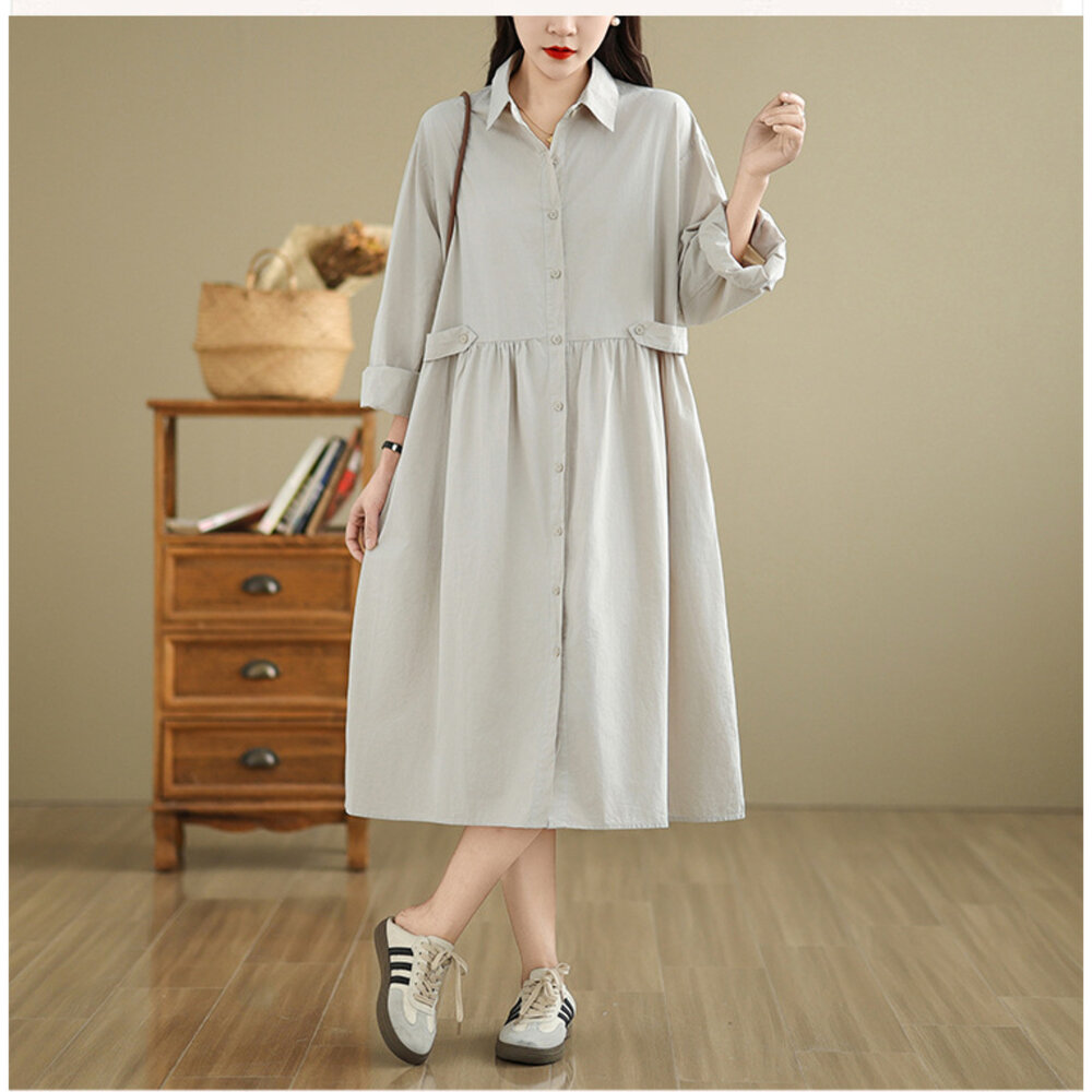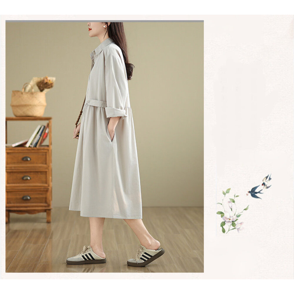 商品資訊/尺寸F/顏色.照片色/材質.棉+人造纖維 尺寸. F./裙長109公分/胸圍.112公分/袖長.57公分/肩寬.50公分 商品會因不同批製作的因素,而有尺寸及顏色上些許落差,尺寸測量正負2公分為正常範圍內喔! 其他資料平放測量平面尺寸