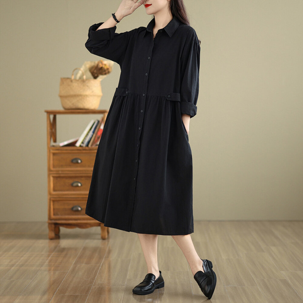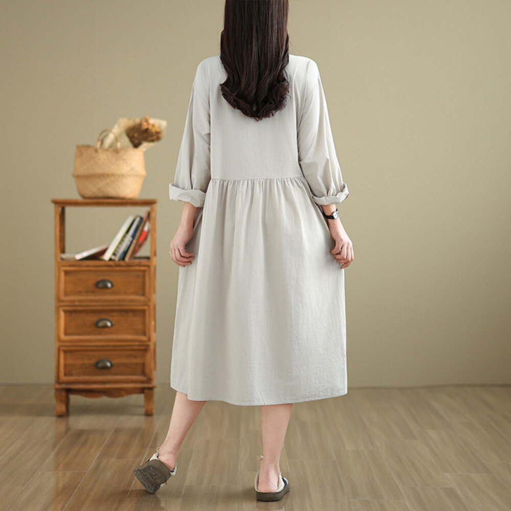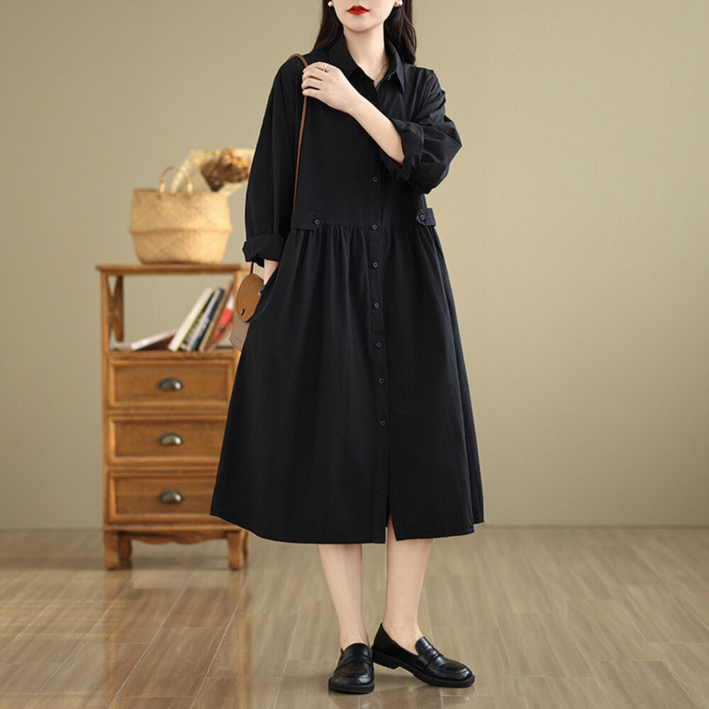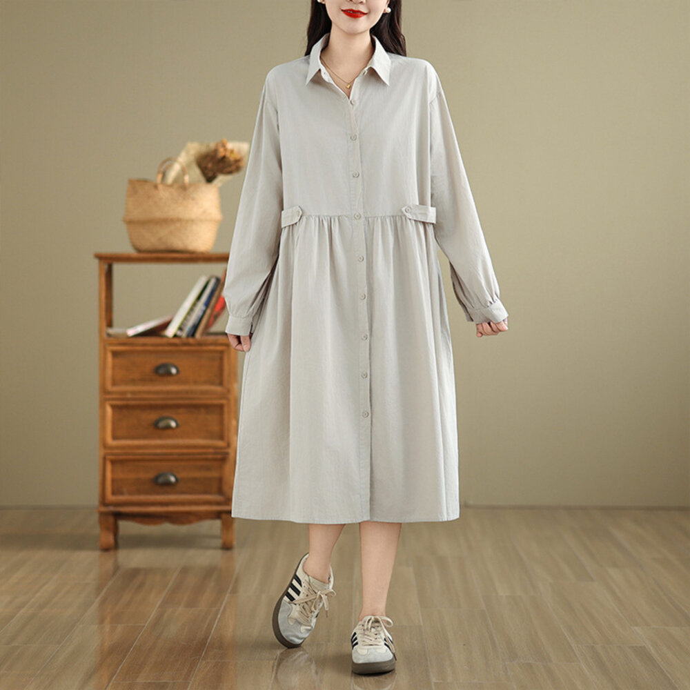 商品資訊/尺寸F/顏色.照片色/材質.棉+人造纖維 尺寸. F./裙長109公分/胸圍.112公分/袖長.57公分/肩寬.50公分 商品會因不同批製作的因素,而有尺寸及顏色上些許落差,尺寸測量正負2公分為正常範圍內喔! 其他資料平放測量平面尺寸