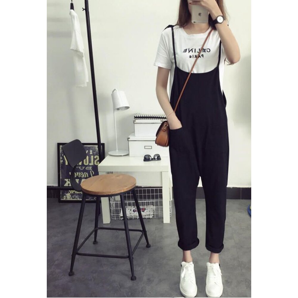 產品資訊/顏色.黑色.灰色/素材.純棉/尺寸.F 全長.128CM/從肩線量全長.108CM/褲腳.33CM/大腿圍.60-70CM /腰圍.108-120CM./褲檔33公分(從肚臍到跨下)/褲檔到腳踝53公分 商品會因不同批製作的因素,而有尺寸及顏色上些許落差,尺寸測量正負2公分為正常範圍內喔! 其他資料平放測量平面尺寸